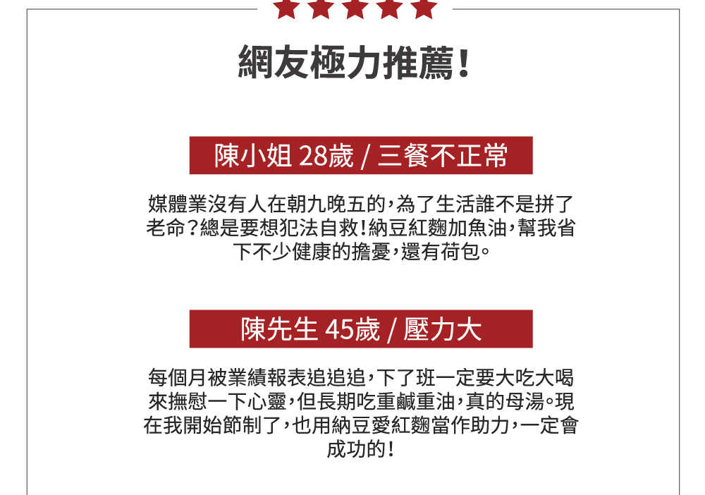 Deerland專利原料,富含3100FU納豆激酶、營養補足好活力。 主要成分 : 魚油、納豆菌、山楂果萃取物、甘蔗蠟萃取物、紅麴。 食用方式 : 每次1粒,每日1-2次,一日食用勿超過2粒,多食無益。 注意事項 : 請置於陰涼乾燥處保存,避免陽光直射,開封後請儘速食用「本產品含有魚類、大豆」。 「時光安好」 專業健康選品者,美國專業製造,為您的健康把關,時光如流,與您一同安好。