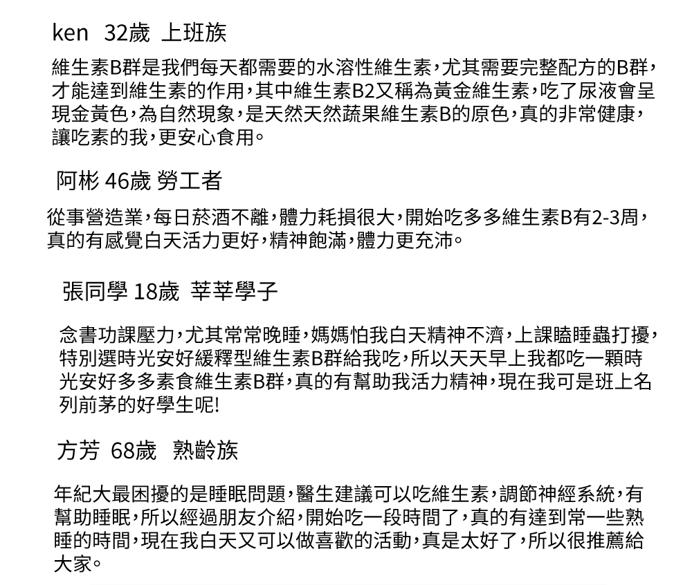 - 主要成分 : 維生素B1、維生素B2、菸鹼醯胺、維生素B6、本多酸鈣、重酒石酸膽鹼、維生素B12、葉酸、生物素、碳酸鈣